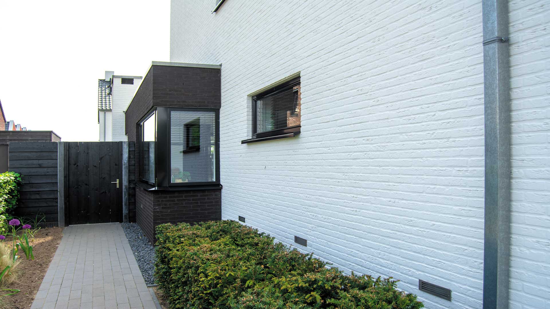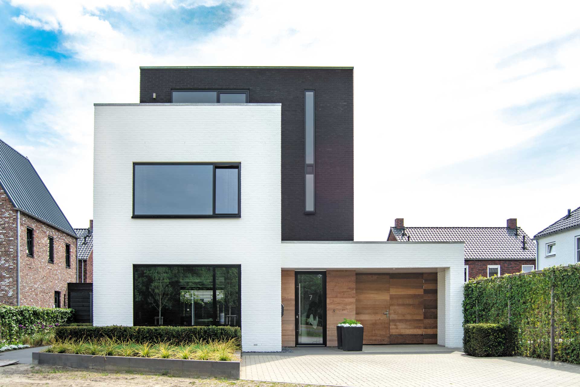 De woning is opgetrokken uit wit geschilderd metselwerk en zwarte baksteen, wat zorgt voor een opvallend contrast tussen het lagere en hogere gedeelte van de woning. Houten accenten in de gevel voegen een element van zachtheid toe, waardoor een warme en uitnodigende uitstraling ontstaat. Deze combinatie van materialen creëert een harmonieus en visueel aantrekkelijke woning die zowel modern als tijdloos aanvoelt.
